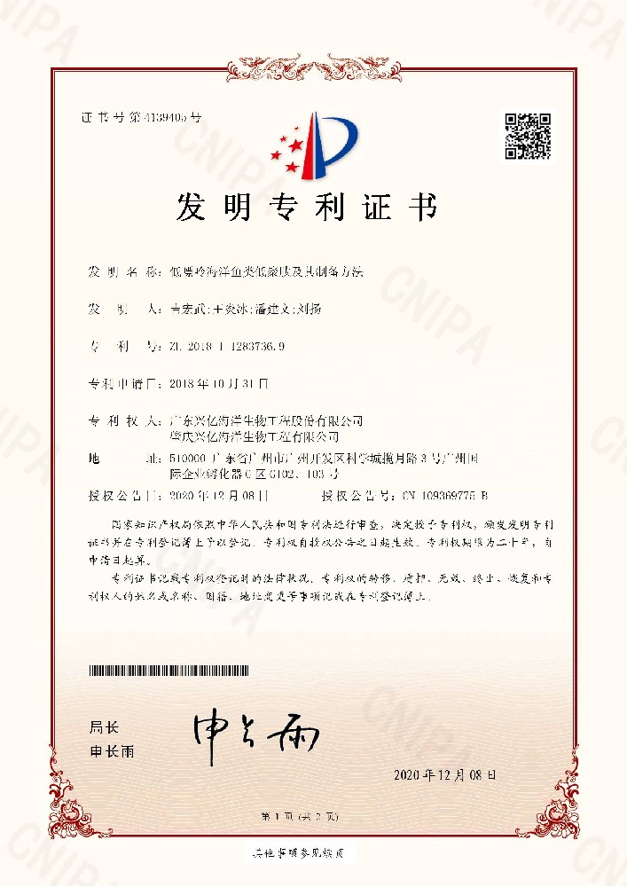 低嘌呤海洋鱼类低聚肽及其制备方法发明专利证书
