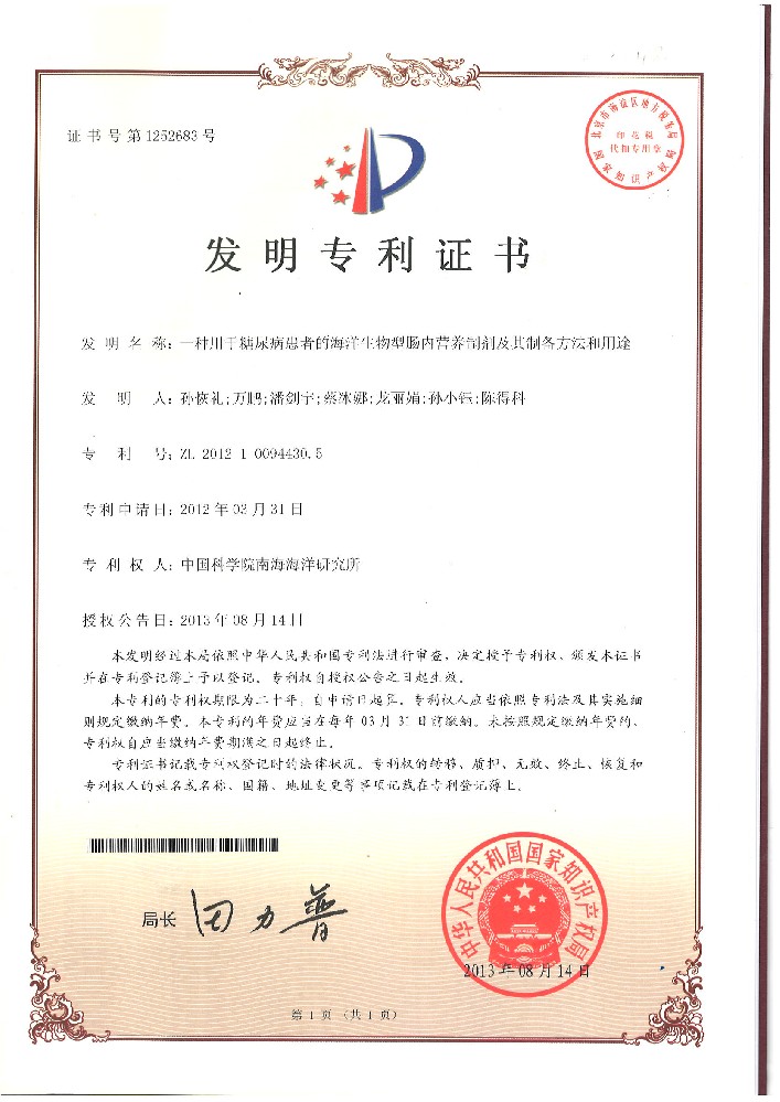 专利 一种金枪鱼蛋白肽提取方法-发明专利证书